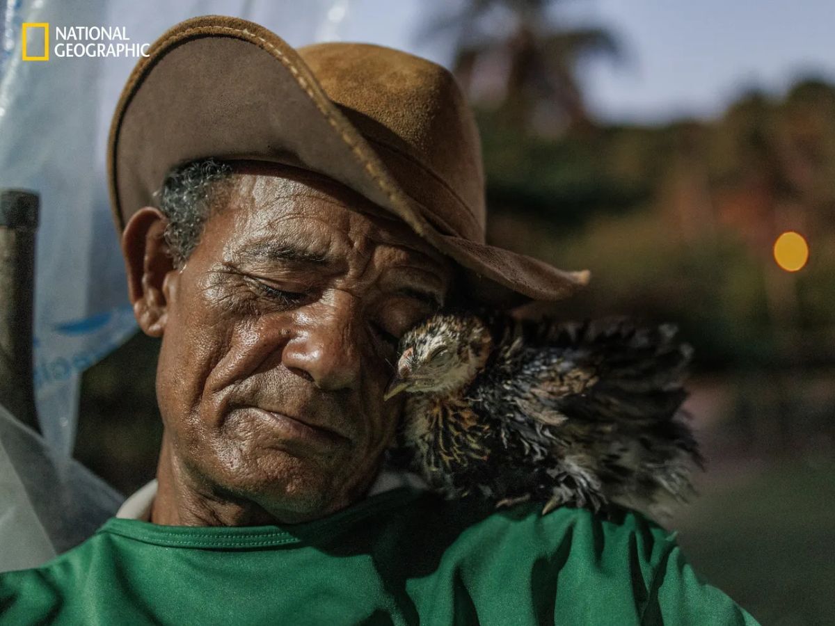 Momento de carinho de Damião Carlos da Silva e seu pintinho | Imagem: Maíra Erlich – Reprodução National Geographic