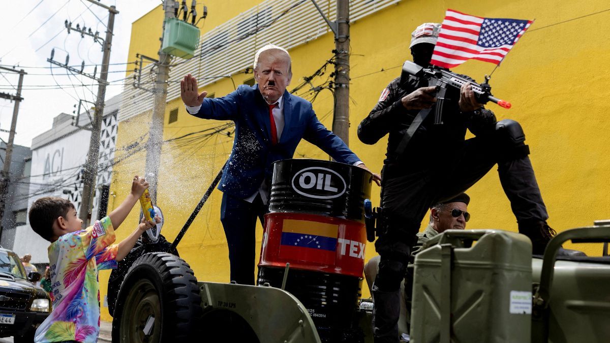 Donald Trump “desfilou” em um jipe militar. O representante do presidente dos Estados Unidos usou uma máscara do mandatário com um bigode simulando o do líder nazista Adolf Hitler. Junto dele, estava um militar com uma bandeira do Estados Unidos junto de um galão de gasolina com a bandeira da Venezuela.
