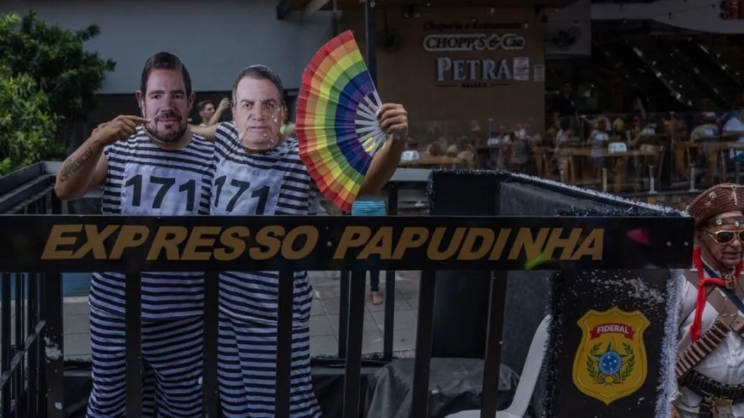 Já Bolsonaro e Vorcaro desfilaram no “Expresso Papudinha”, um carro que simulava uma cela de prisão. Seus representantes estavam com roupas caricatas de presidiários com o número 171 no peito, referente ao crime de estelionato no Código Penal Brasileiro.