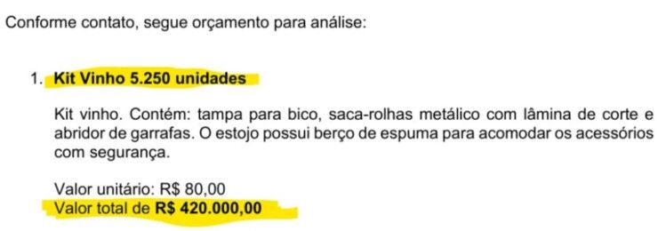 O patrocínio envolvia a distribuição para convidados de um kit vinho com custo unitário de R$ 80. Os brindes continham bico de vinho metálico, saca-rolhas com lâmina de corte e abridor de garrafas.