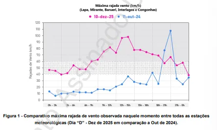 “Ao longo de cerca de 12 horas (do dia 10 de dezembro), foram registrados ventos sustentados elevados, com rajadas recorrentes superiores a 60 km/h e picos de até 98 km/h“, explicou a Enel no início do documento que a Rádio TMC teve acesso. A empresa ainda comparou com dados das rajadas de outubro de 2024, em que tiveram ventos até mais fortes, mas com menor intensidade ao longo do dia.