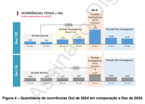 “A análise baseada no total acumulado de clientes impactados, indicador mais aderente à natureza do evento, evidencia que aproximadamente 4,2 milhões de clientes foram afetados ao longo do Dia D, valor substancialmente superior ao que seria percebido pela avaliação exclusiva da curva de clientes interrompidos simultaneamente. Essa abordagem confirma a maior complexidade operacional imposta à Distribuidora no evento de 2025“, escreveu a Enel.