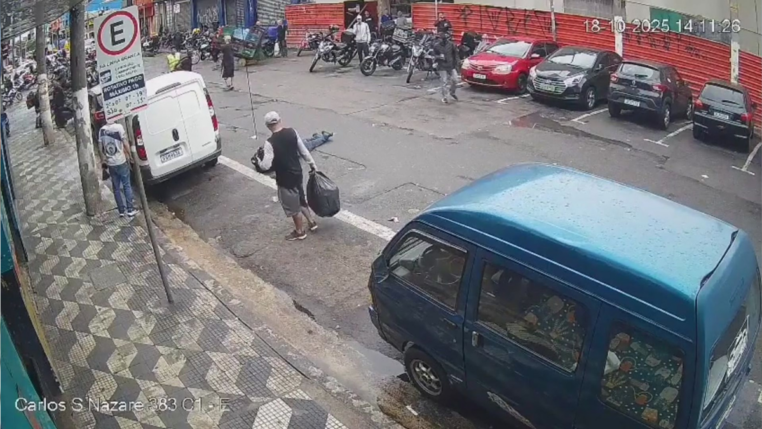 Um motofretista foi baleado na cabeça durante um assalto na região da rua 25 de Março, no centro de São Paulo, na tarde deste sábado (18/10). O crime aconteceu na rua Carlos de Sousa Nazaré, uma travessa da via de comércio popular, e foi registrado por câmeras de segurança.