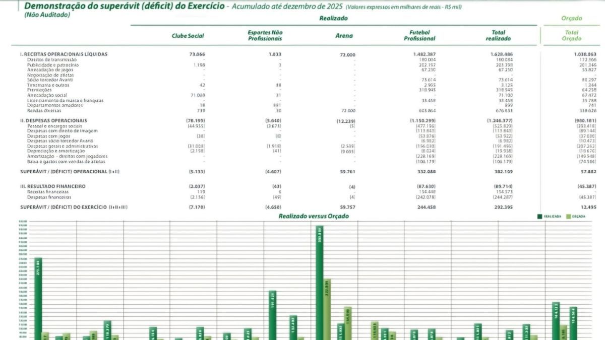 Nas receitas totais, o alviverde tinha previsão de arrecadar R$ 1 bilhão e, para a alegria interna, o realizado foi R$ 628 milhões a mais do que o previsto, encerrando desta maneira o ano de 2025 com receitas operacionais líquidas em R$ 1,628 bilhão.