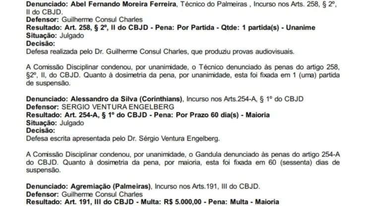 Por unanimidade, o técnico Abel Ferreira foi condenado a um jogo de suspensão, que já foi cumprido na partida contra o Guarani, em 15 de fevereiro, desta forma, o treinador palmeirense está liberado para comandar a equipe na primeira rodada do Paulistão de 2027.