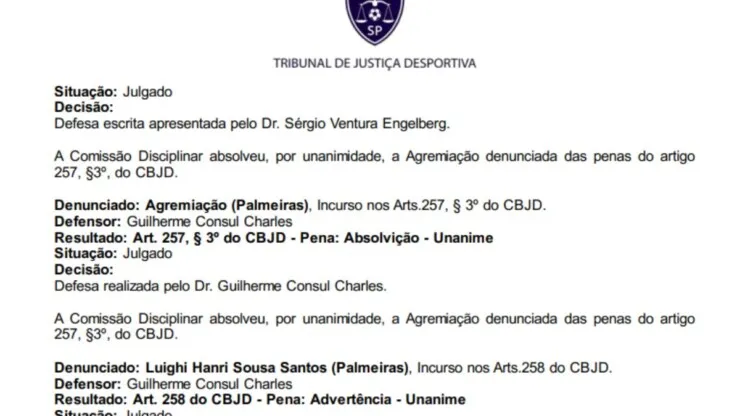Enquadrado em dois artigos pelo TJD-SP, o 213 e o 257, o Corinthians foi absolvido de ambos e não terá que arcar com multas. No entanto, o Palmeiras foi punido no artigo 191 do CBJD e terá que pagar R$ 5000, por “dificultar o cumprimento de regulamento, geral ou especial, de competição”.