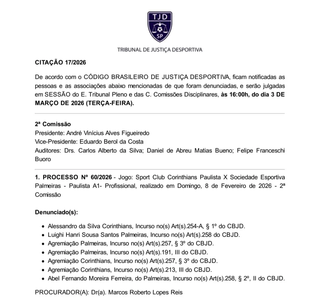 O Tribunal de Justiça Desportiva de São Paulo marca para o dia 3 de março o julgamento referente aos acontecimentos do Dérbi de 8 de fevereiro, na Neo Química Arena, que terminou com a vitória do Palmeiras por 1×0.