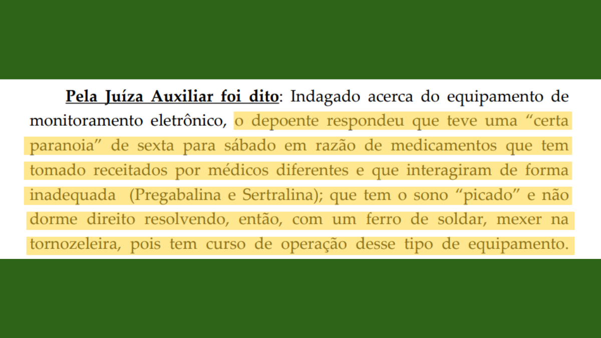 Segundo o documento, Bolsonaro relatou que teve “alucinação” de que havia uma escuta instalada no equipamento e, por isso, resolveu usar um ferro de solda para abrir a estrutura — algo que, disse, sabia manusear por ter curso na área. Ele afirmou ainda que vem tomando pregabalina e sertralina, medicamentos usados em tratamentos psiquiátricos, e que iniciou um deles apenas quatro dias antes do episódio.