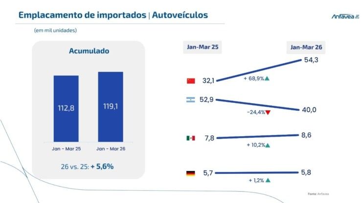 Entre os veículos importados, a China se consolidou como principal origem, respondendo por 54,3% das vendas no Brasil, com crescimento de 68,9% no período.