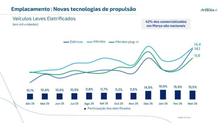 Outro destaque do setor é o avanço dos veículos eletrificados. As vendas já se aproximam de 100 mil unidades em 2026, quase o dobro do registrado no primeiro trimestre do ano passado, indicando uma mudança gradual no perfil do mercado.
