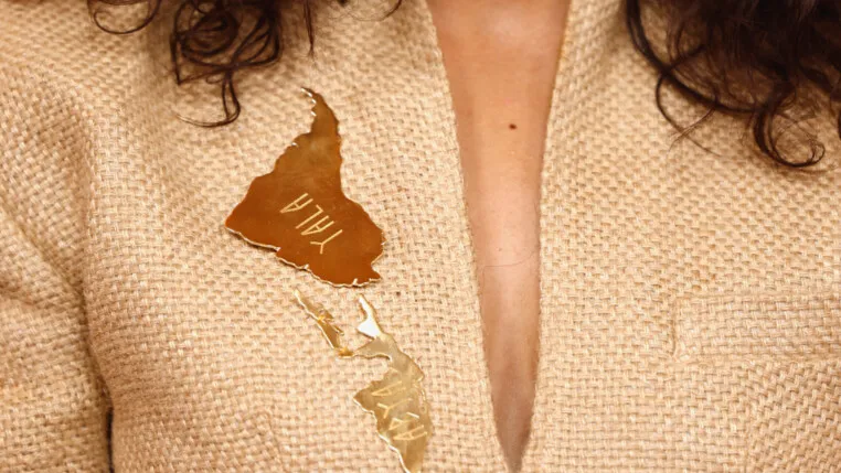 A atriz Alice Carvalho participou do tapete vermelho do Oscar 2026 neste domingo (15/03), em Los Angeles, nos Estados Unidos, em um visual em tons terrosos com um broche dourado em tributo à América Latina.