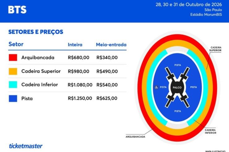 Mapa do Estádio MorumBIS para o show do BTS. (Imagem: Reprodução/ Ticketmaster)