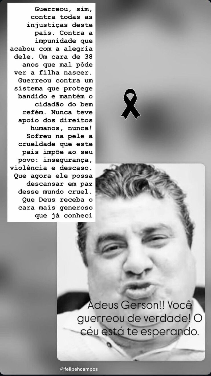 A ex-mulher finalizou sua homenagem com: “Adeus, Gerson. Você guerreou de verdade. O céu está te esperando”. A mensagem foi publicada nos Stories com uma fotografia do ex-companheiro em preto e branco e o símbolo do luto.