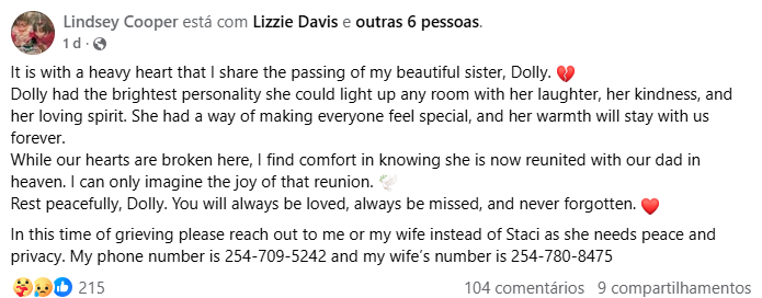 Segundo informações, Dolly estava internada no hospital “lutando pela própria vida”. Lindsey acrescentou que a família está com o coração partido, mas encontra conforto em acreditar que Dolly se reuniu com o “pai”, escrevendo: “Descanse em paz… você sempre será amada, sempre fará falta e nunca será esquecida.”
