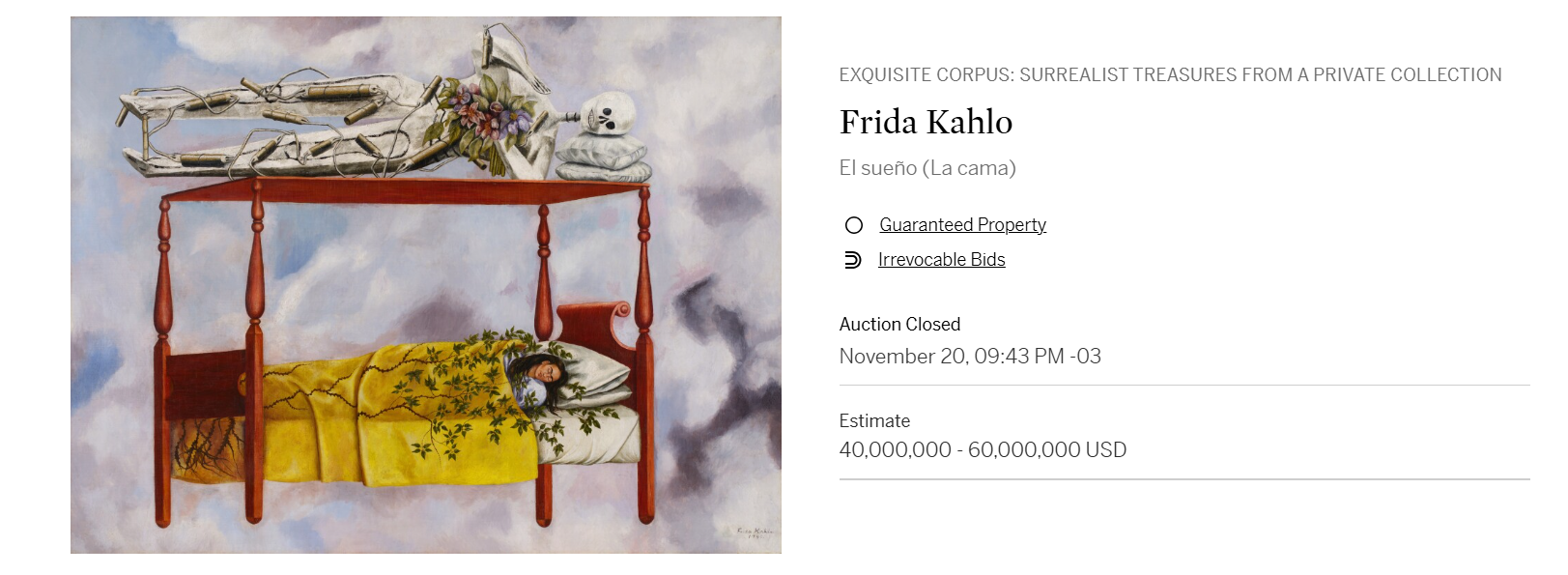 A pintura de Frida já foi exibida em galerias de Londres, Berlim, Nova York e Cidade do México. Segundo a Sotheby’s, “El Sueño (La Cama)” está entre as obras psicologicamente mais marcantes e formalmente mais instigantes da artista: um autorretrato surreal e profundamente introspectivo que combina simbolismo pessoal, iconografia cultural mexicana e surrealismo.