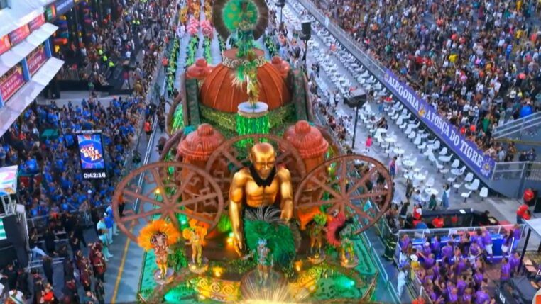 O desfile teve como ponto alto o carro abre-alas, que trazia o tigre, símbolo da escola, e uma escultura articulada da “mãe do ouro”, que realizava movimentos mecânicos de reza e levantamento. A agremiação demonstrou domínio rítmico ao realizar uma pausa momentânea no som, mantendo a cadência do samba apenas com o bater de palmas dos componentes.