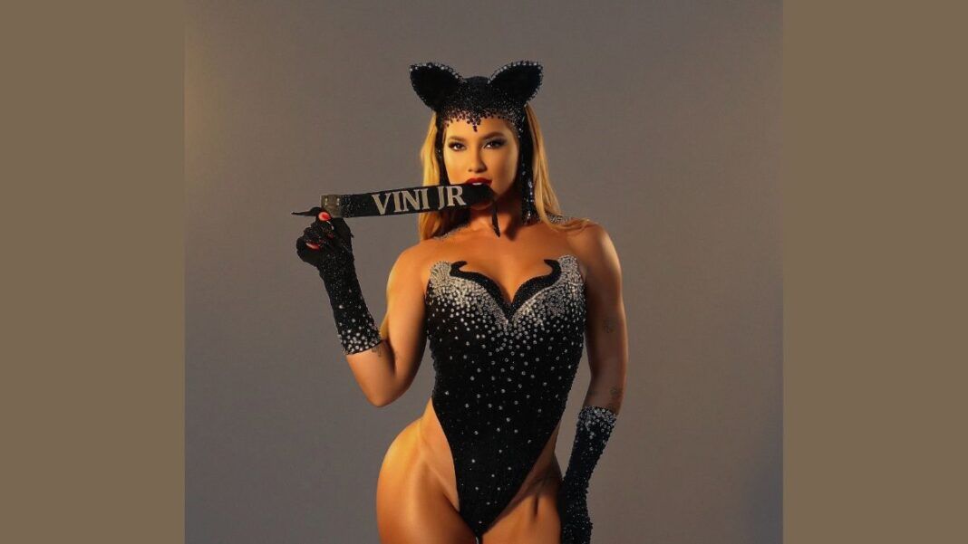 A influenciadora Virginia Fonseca, atual rainha de bateria da Grande Rio, homenageou Luma de Oliveira em ensaio fotográfico feito pelo gshow (veja no final desta matéria), na mansão do namorado dela, Vini Jr., na Barra da Tijuca. A empresária posou com body ultracavado e cravejado de cristais e uma coleira exibindo o nome do jogador de futebol, recriando a icônica fantasia de onça usada por Luma no Carnaval de 1998.