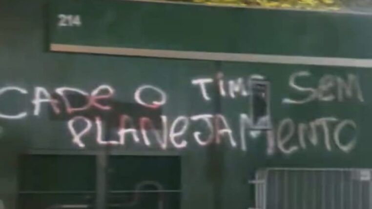 Frases como “2025 de novo”, “Cadê o planejamento?”, “Abel, acabou a magia?”, “Time sem vergonha”, “SPAlmeiras” e ofensas a presidente Leila Pereira se destacaram nos muros que dão acesso as bilheterias e entrada principal do clube social.