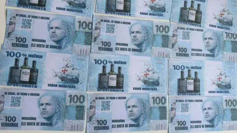 As cédulas trazem o rosto do treinador português acompanhado de mensagens de protesto. O material inclui frases como “No Brasil, só treino o Cruzeiro”, “Mercenário, ele gosta de dinheiro”, “100 vergonha”, “100 caráter”, “100% ingênuo”, “Oportunista” e “Sabor ingratidão”.