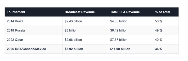 A FIFA irá gerar um recorde de US$ 3,92 bilhões com os direitos de transmissão da Copa do Mundo de 2026. Isso representa 36% da receita total da FIFA para o ciclo 2023/2026, estimada em US$ 11 bilhões.