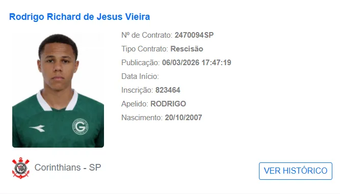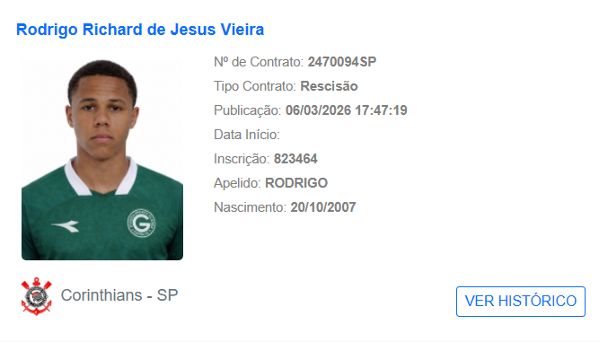 Rodrigo Gelado, zagueiro de 18 anos (nasceu em 2007), deixou o Corinthians, que acertou a transferência do jogador junto ao Goiás. A informação foi apurada com exclusividade pela TMC.