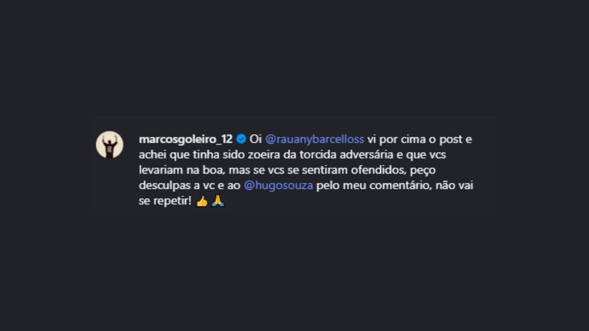 “Oi, Rauany. Vi por cima o post e achei que tinha sido zoeira da torcida adversária e que vocês levariam na boa, mas se vocês se sentiram ofendidos, peço desculpas a você e ao Hugo Souza pelo meu comentário. Não vai se repetir”, declarou.