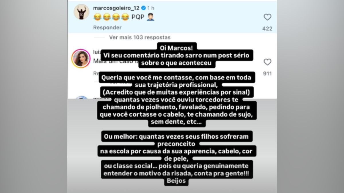 “Oi, Marcos! Vi seu comentário tirando sarro num post sério sobre o que aconteceu. Queria que você me contasse, com base em toda sua trajetória profissional, quantas vezes você ouviu torcedores te chamando de piolhento, favelado, pedindo para que você cortasse o cabelo, te chamando de sujo, sem dente… Ou melhor: quantas vezes seus filhos sofreram preconceito na escola por aparência, cabelo, cor de pele ou classe social? Pois eu queria genuinamente entender o motivo da risada. Conta pra gente!”, escreveu Rauany.