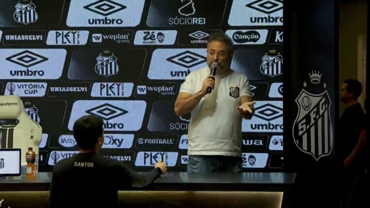 Diretor de futebol do clube santista se desentendeu com o repórter Vagner Frederico durante coletiva na Vila Belmiro
