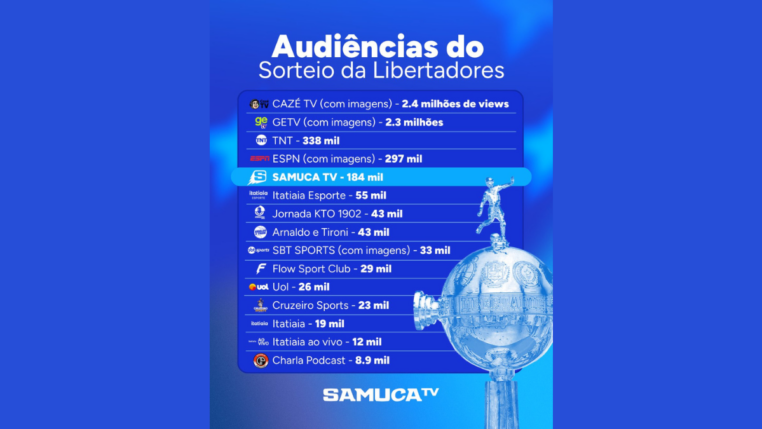 A Samuca TV atingiu a quinta maior audiência entre os canais que transmitiram o sorteio da Libertadores na quinta passada, considerando react e exibição com imagem. A plataforma 100% dedicada à cobertura do Cruzeiro superou players tradicionais como Rádio Itatiaia, líder disparada de audiência em Minas Gerais, SBT e UOL.