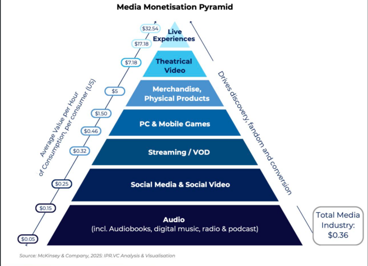 Essa leitura ganha peso quando colocada ao lado da pirâmide de monetização apresentada no relatório da IPR.VC, uma firma finlandesa de venture capital focada em propriedades intelectuais do entretenimento.
