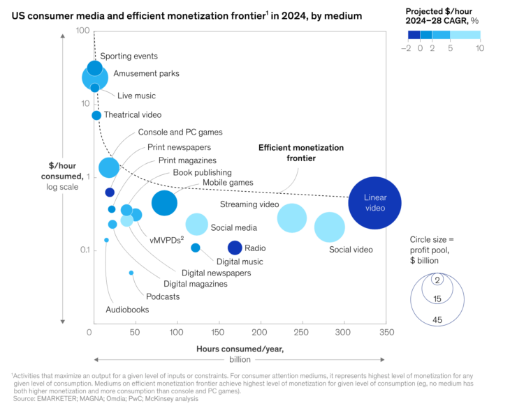 A McKinsey também aponta que o número total de horas diárias que os consumidores dedicam à mídia cresceu apenas 1% a 2% ao ano na última década. Enquanto isso, a oferta explodiu: há 50 vezes mais usuários amadores do que profissionais no Spotify, 25 mil vezes mais horas de conteúdo produzidas no YouTube em 2024 do que em todas as emissoras de televisão e serviços de streaming juntos.