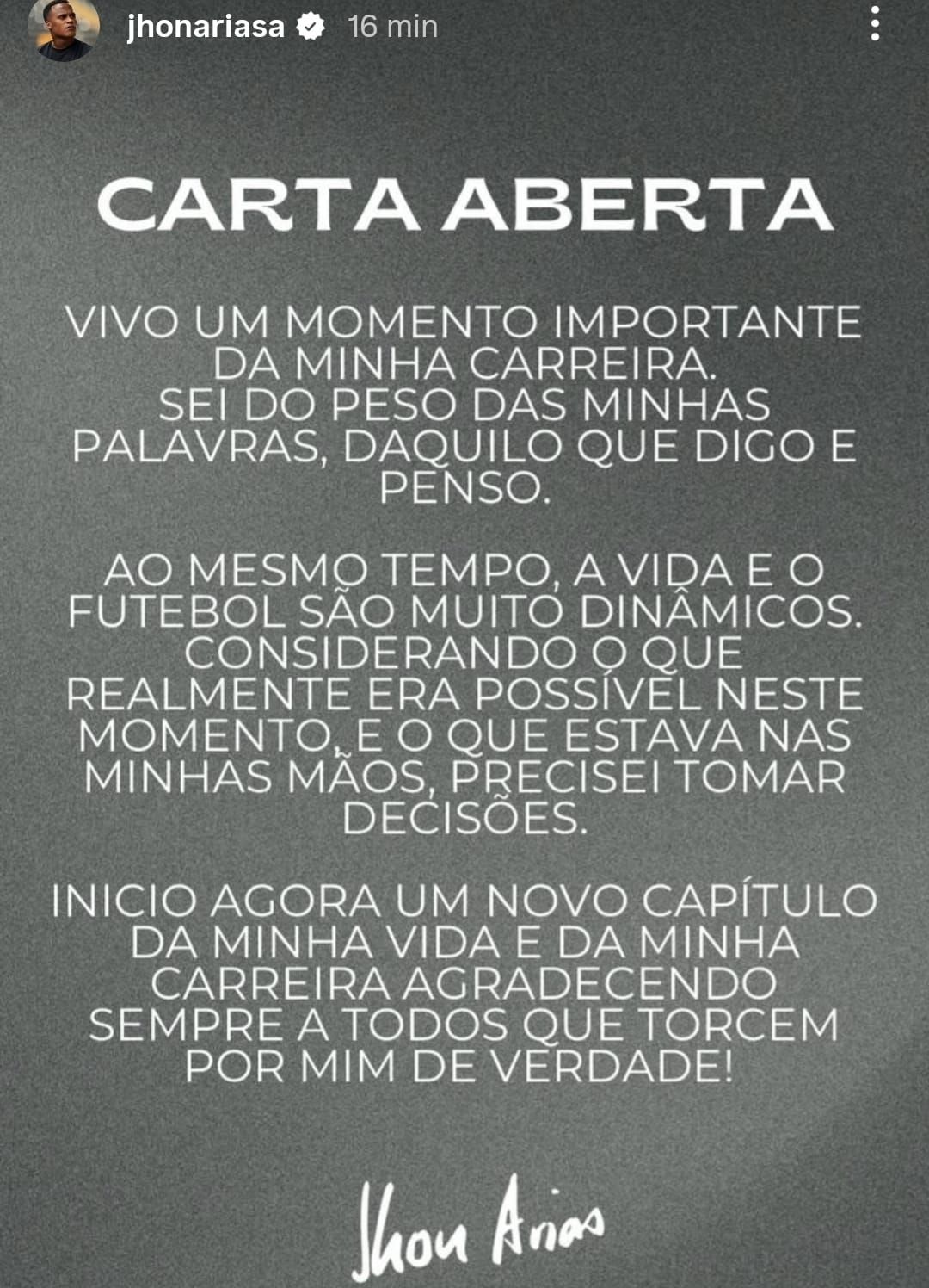 Anunciado como reforço do Palmeiras na manhã deste sábado (7), Jhon Arias publicou uma carta aberta aos torcedores do Fluminense.