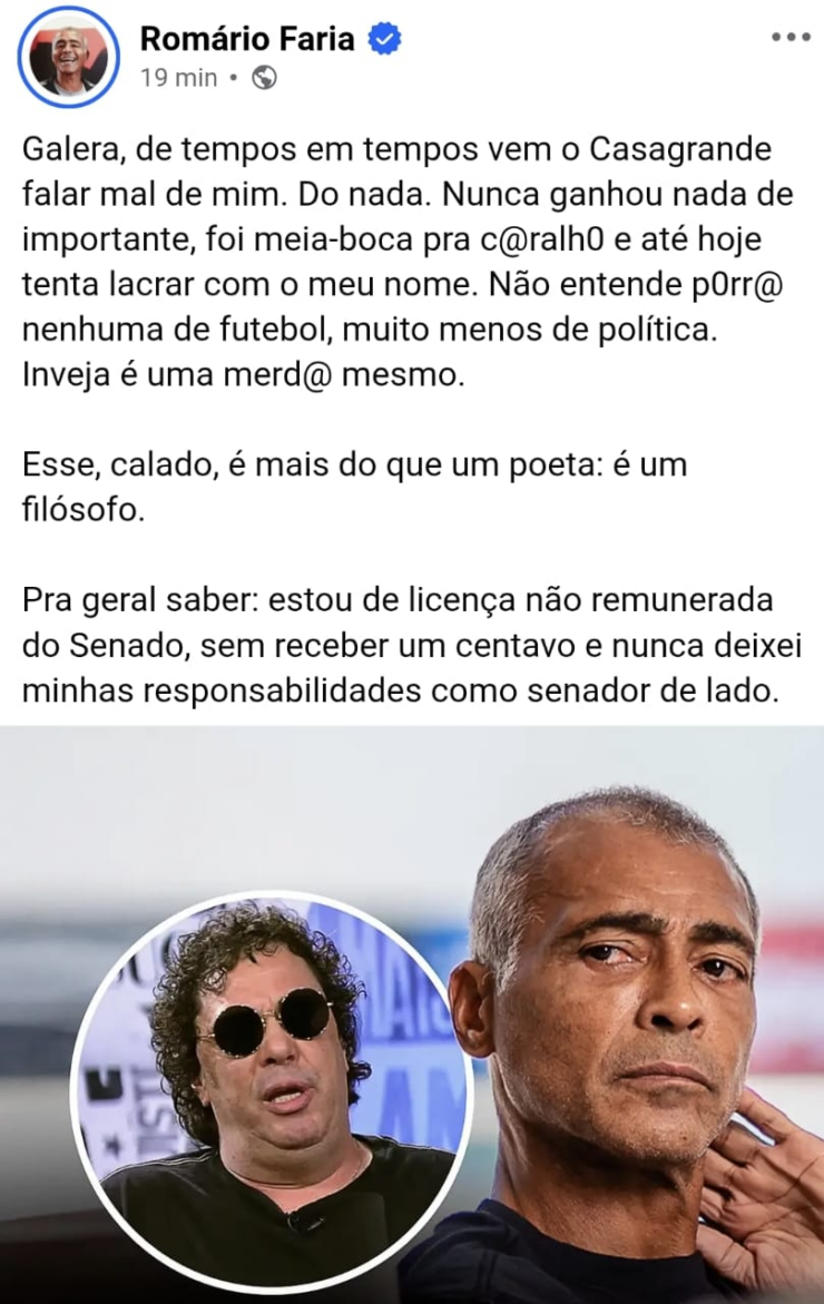 O senador Romário (PL-RJ) respondeu ao comentarista e ex-jogador Walter Casagrande Júnior, que questionou a ausência do parlamentar no Senado. O tetracampeão mundial pela Seleção Brasileira informou nesta quarta-feira (25/03) que está licenciado das funções legislativas por 121 dias, conforme previsto no regimento interno da Casa.
