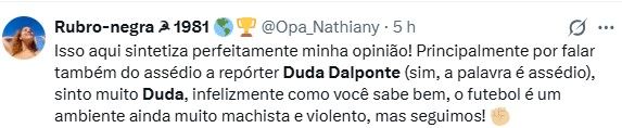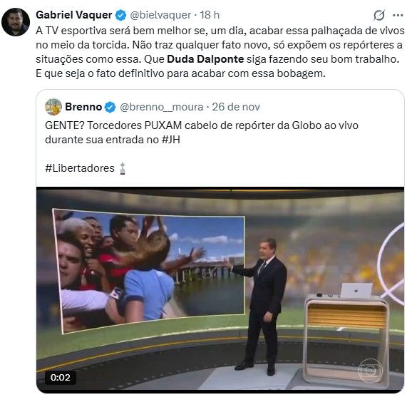 A repórter Duda Dalponte, estava fazendo a cobertura do embarque da delegação do Flamengo rumo à final da Copa Libertadores da América que acontece neste sábado (29). Sob pressão da torcida presente no aeroporto, Dalponte teve seu cabelo puxado repetidas vezes.