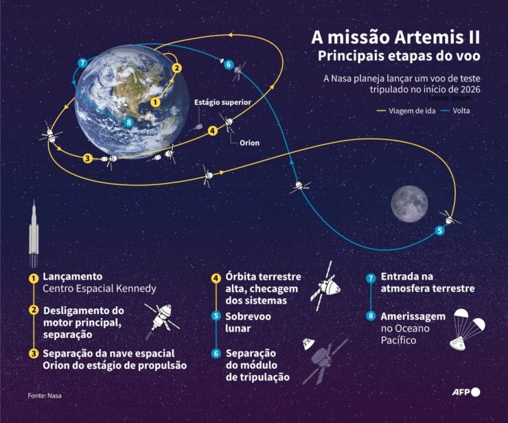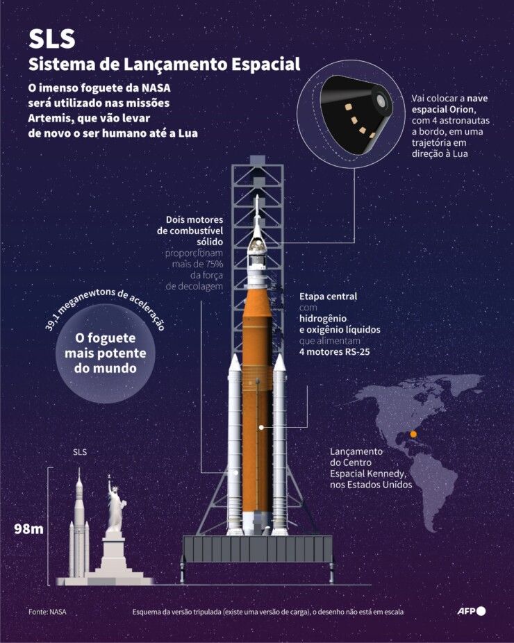 O lançamento será feito a partir do Centro Espacial Kennedy, nos Estados Unidos. No topo do foguete segue a cápsula Orion, projetada para levar até quatro astronautas rumo à Lua.