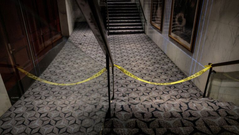 Fita policial isola a área que dá acesso ao salão de baile do hotel Washington Hilton, onde ocorreu um tiroteio na noite de ontem durante o jantar anual da Associação de Correspondentes da Casa Branca, em Washington, nos EUA (Foto: REUTERS/Kylie Cooper)