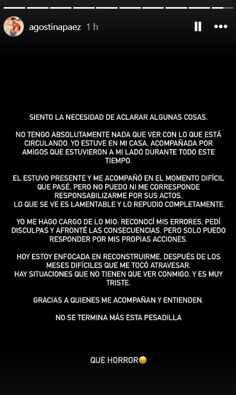 Diante da repercussão, Agostina Páez se manifestou nas redes sociais para se desvincular das atitudes do pai. Ela classificou o conteúdo como “lamentável” e afirmou repudiar completamente o comportamento exibido.