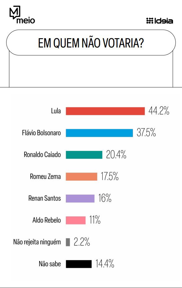 O levantamento também mediu os índices de rejeição dos principais nomes na disputa. Nesse cenário, o presidente Lula aparece como o mais rejeitado, com 44,2% dos entrevistados afirmando que não votariam nele de jeito nenhum. O dado indica um nível elevado de resistência a sua candidatura, fator que pode influenciar diretamente o desempenho em um eventual segundo turno.