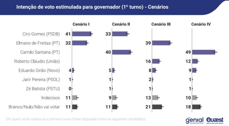 No primeiro turno, a pesquisa mostra um ambiente fragmentado e altamente dependente da configuração das candidaturas. Em um dos cenários testados, Ciro Gomes lidera com 41%, enquanto o atual governador Elmano de Freitas soma 32%, com os demais nomes aparecendo bem atrás. Em outra simulação, com a entrada de Camilo Santana, o ex-governador passa a liderar com 40%, superando Ciro, que aparece com 33%.
