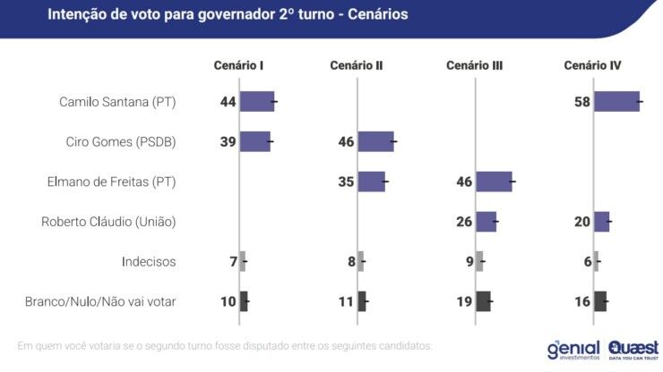 Já nas simulações de segundo turno, os resultados variam conforme os nomes, indicando vantagem de Camilo Santana (PT) em alguns cenários e de Ciro em outros, mantendo o quadro eleitoral em aberto.