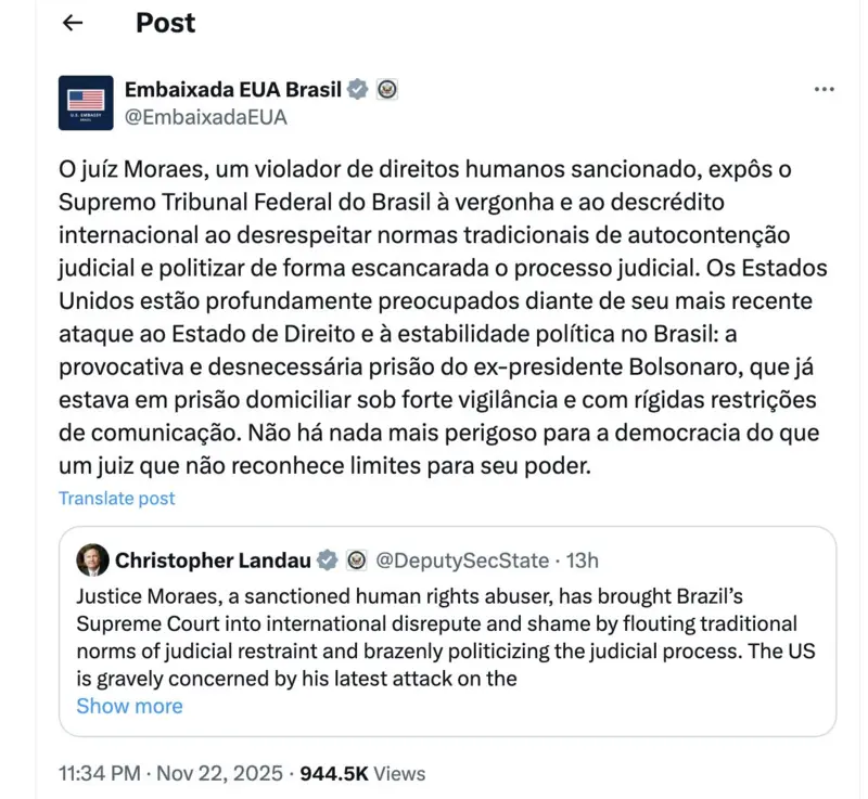 “O juiz Moraes, um violador de direitos humanos sancionado, expôs o Supremo Tribunal Federal do Brasil à vergonha e ao descrédito internacional ao desrespeitar normas tradicionais de autocontenção judicial e politizar de forma escancarada o processo judicial. Os Estados Unidos estão profundamente preocupados diante de seu mais recente ataque ao Estado de Direito e à estabilidade política no Brasil: a provocativa e desnecessária prisão do ex-presidente Bolsonaro, que já estava em prisão domiciliar sob forte vigilância e com rígidas restrições de comunicação. Não há nada mais perigoso para a democracia do que um juiz que não reconhece limites para seu poder.”