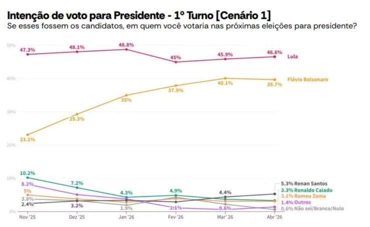 No primeiro cenário, com sete nomes, Lula alcança 46,6% das intenções de voto. Flávio Bolsonaro fica com 39,7%. Em março, o presidente registrava 45,9%. O senador tinha 40,1%. Renan Santos aparece em terceiro lugar com 5,3%. Em março, ele tinha 4,4%. Ronaldo Caiado registra 3,3%. Romeu Zema tem 3,1%. Os dois ex-governadores ficam empatados dentro da margem de erro na quarta posição. O psiquiatra Augusto Cury (Avante) tem 1,1%. Aldo Rebelo (DC), ex-ministro, registra 0,3%. Indecisos e eleitores que pretendem anular ou votar em branco não somam 1%.