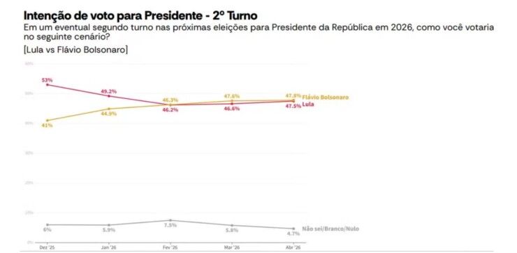 A pesquisa simulou cenários de segundo turno envolvendo Flávio Bolsonaro contra outros pré-candidatos além de Lula. Na disputa entre Flávio e Lula, o levantamento traz um empate técnico com 47,8% para Flávio e 47,5% para Lula.