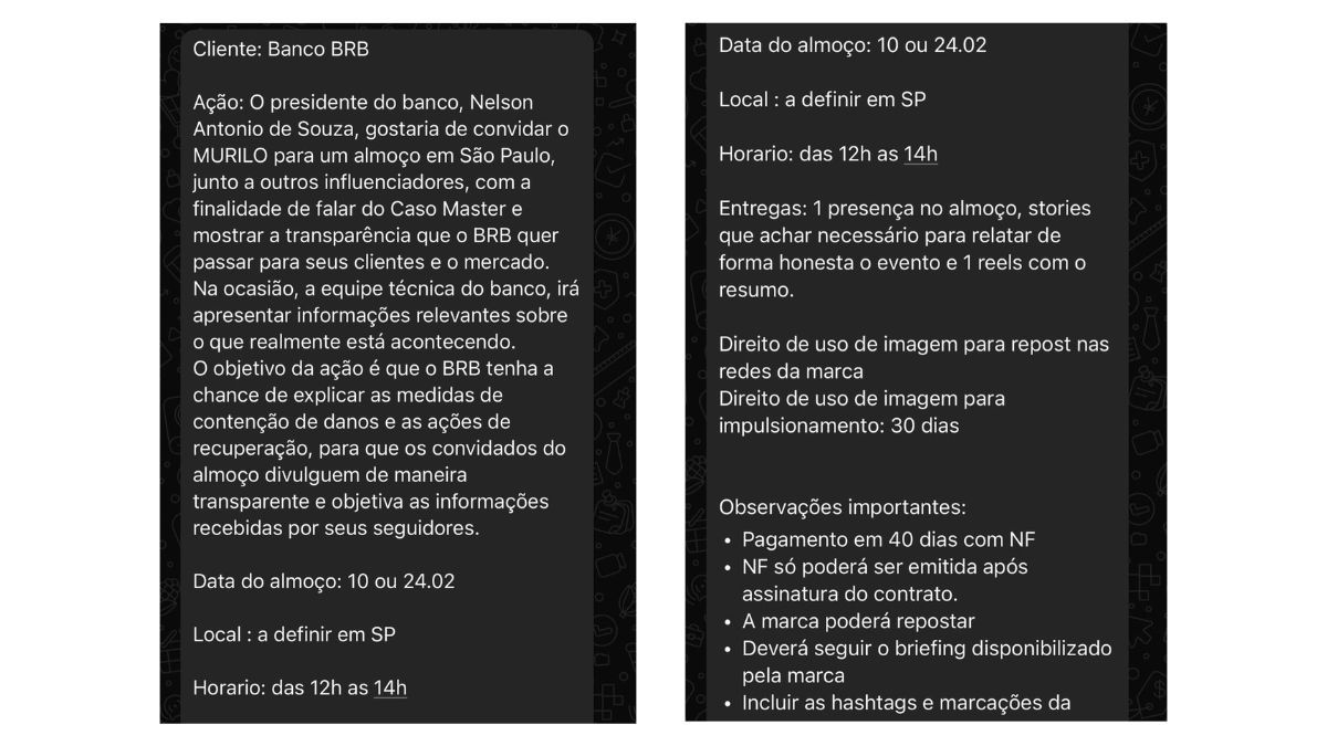 “Na ocasião, a equipe técnica do banco, irá apresentar informações relevantes sobre o que realmente está acontecendo. O objetivo da ação é que o BRB tenha a chance de explicar as medidas de contenção de danos e as ações de recuperação, para que os convidados do almoço divulguem de maneira transparente e objetiva as informações recebidas por seus seguidores”, dizia outro trecho do e-mail divulgado pelos influenciadores.
