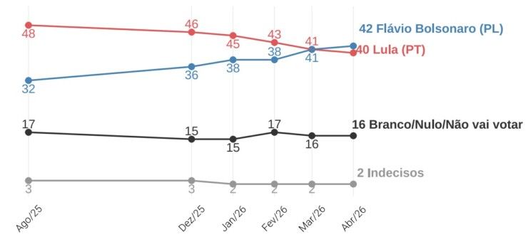 No principal cenário testado para o 1º turno, Lula tem 37% das intenções de voto, contra 32% de Flávio Bolsonaro, consolidando a polarização entre os dois nomes. Outros candidatos aparecem bem atrás, com destaque para Ronaldo Caiado (6%) e Romeu Zema (3%).